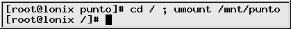 Antes de apagar Linux, es conveniente desmontar la partición hda3, y para eso primero hay que salir del directorio /mnt/punto. Podemos hacer las dos cosas con una sola orden: